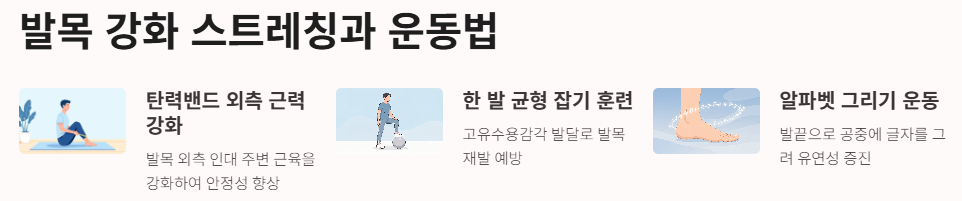 운동 전 충분한 스트레칭, 발목 근력 강화 운동, 미끄럽지 않은 신발 선택이 중요합니다. 평소 발목을 자주 접질리는 편이라면 보호대를 활용하는 것도 좋은 예방법이 됩니다.