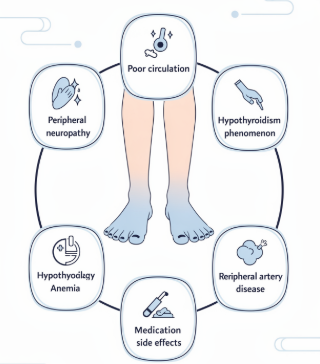 당뇨가 있는 경우 말초신경 손상이나 혈관 문제로 인해 발이 차고 저린 증상이 나타날 수 있습니다. 또한 갑상선 기능 저하증은 기초대사량 감소로 체온이 전반적으로 낮아져 발 냉증을 유발할 수 있습니다.